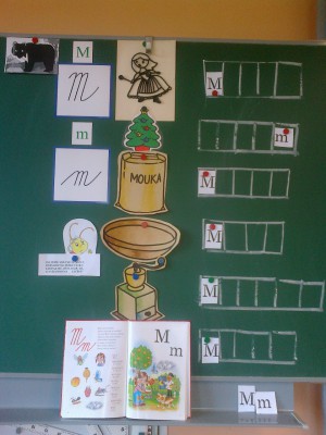 V hodině českého jazyka trénujeme práci s mřížkou, hledáme písmeno m,M, vymýšlíme slova s M.