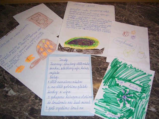 14.11.2013 20:12Včera se nám ve škole doslova sbíhaly sliny, měli jsme třídu plnou dobrot sladkých i slaných... Děti totiž perfektně splnily domácí úkol a vyrobily si vlastní kuchařku s receptem - na tousty, lívanečky, bábovku, muffiny, míchaná vajíčka, volské oko, placky, jablkový koláč, palačinky, obložený chlebík, čaj a různé jiné mňamky. Recepty se seznamem surovin a postupem přípravy většina vyzdobila obrázky a někteří dokonce i fotem. Hodně dětí si doma recept i vyzkoušelo a zapojilo do přípravy celou rodinu, dokonce došlo i k jednomu zranění. Doufám, že Markétka na vaření i přes ty dva stehy na ruce nezanevře :-).