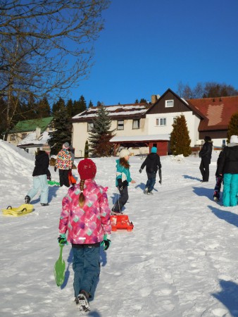 Ihned první den po příjezdu a dobrém obědě jsme vyrazili na obhlídku okolí, zda se zde nevyskytují nějaká podivná individua. Abychom byli mobilnější, vzali jsme si coby dopravní prostředek boby a lopaty.