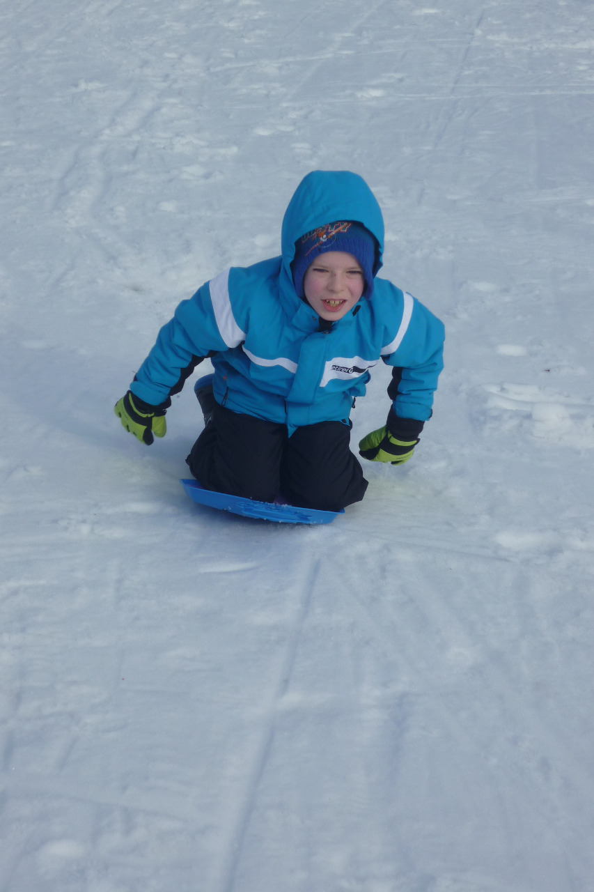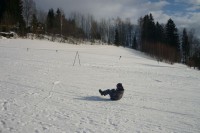 Cesta autobusem a občerstvení na benzínce proběhlo k všeobecné spokojenosti, v autobuse jsme sledovali Tajemství staré bambitky, na chatě nás čekal oběd a HURÁ na sníh. Popadli jsme pekáče, lopaty, vydali jsme se prozkoumat stanici vleku a potom zááávody jednotlivců, dvojic i trojic. Svezli se i rodiče!
